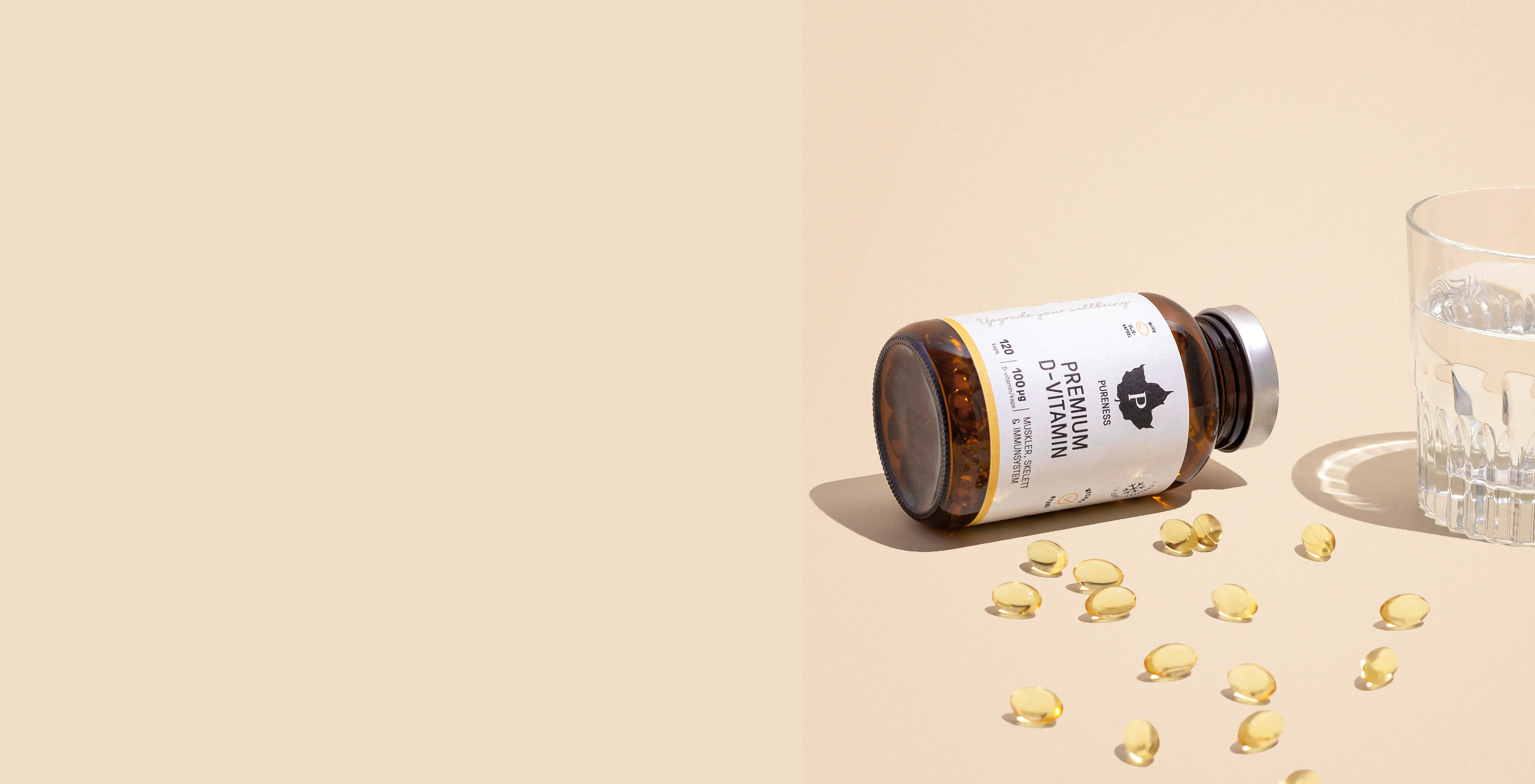 I Pureness sortiment hittar du D-vitamin i produkten Premium D-vitamin som finns i två olika styrkor - välj mellan 50 och 100 µg (50 & 100 mikrogram).